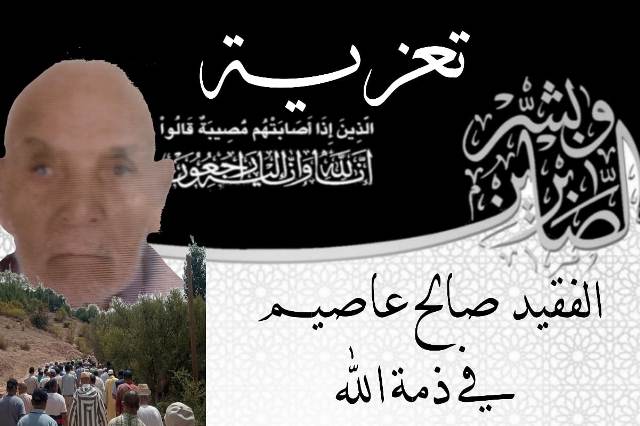 بعيون دامعة وقلوب خاشعة راضية بقضاء الله وقدره، تلقينا نبأ وفاة الفقيد صالح عاصيم بدوار الزاوية واويزغت إقليم أزيلال.
