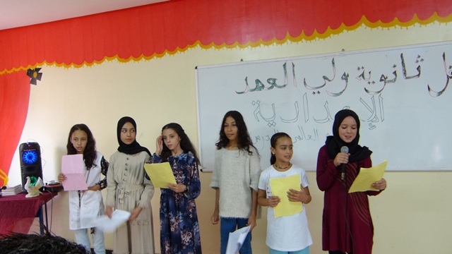 كما ألقيت خلال الحفل كلمة المؤسسة، ألقتها التلميذين فاطمة الزهراء البحراوي والتلميذة ملاك جعفري ، تدرسان بالأولى إعدادي، حيث أشرفا على تنشيط الحفل البهيج، وأكدتا عن اعتزاز كل مكونات ثانوية ولي العهد بأطرها التربوية وجميع المدرسين، واعتبرتا الاحتفال يهدف إلى الارتقاء بالرسالة التربوية عن طريق حفز الأطر التربوية ولو رمزيا.
