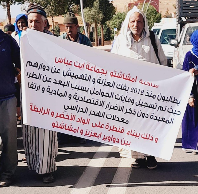 وكشفت مصادر من المحتجين، أن مسيرة الساكنة قطعت أزيد من 90 كيلومترا مشيا على الاقدام في زمن 48 ساعة مشيا على الاقدام لإيصال صوتها ومطالبها لعامل إقليم أزيلال، والتدخل لبناء قنطرة تفك العزلة على ساكنة دوار امشاشتو بايت عباس.