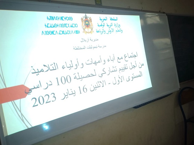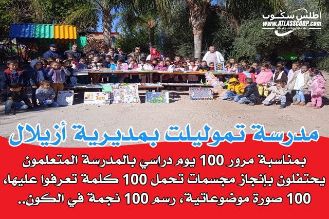 بمدرسة تيموليلت المختلطة التابعة لجماعة تيموليلت بمديرية أزيلال احتفل تلامذة السنة الأولى بمرور مئة يوم بالمدرسة، ومن الطقوس اليومية التي اعتاد التلاميذ القيام بها داخل القسم قراءة تاريخ اليوم وعَد أيام الدراسة منذ بداية الموسم الدراسي. يوم الإثنين 16 يناير 2023 أتم التلاميذ 100 يوم الأولى بالمدرسة. وقام أستاذ اللغة الفرنسية للمستوى الأول السيد إسماعيل بوهاشم بنسخ التجربة الفرنسية وتطويرها لتواكب مستجدات التربية والتكوين التي تدعو إلى تعبئة مجتمعية مستدامة. حيث ثم القيام بمعرض للأعمال اليدوية التي أنجزها التلاميذ والتي تجسد مرور 100 يوم في المدرسة، ودشن المفتشان التربويان السيد مصطفى فوزي و السيد خالد العلوي المعرض رفقة السيد مدير المؤسسة، وثَمن السادة المفتشين الرؤية التربوية و البيداغوجيا للمشروع. بالإضافة إلى ذلك ثم عقد اجتماع مع آباء وأمهات وأولياء التلاميذ زوال نفس اليوم الاثنين 16 يناير 2023، من أجل تقديم حصيلة 100 يوم من الدراسة وتقييم تشاركي لتلك الفترة، وتم تنزيل البرنامج التالي: