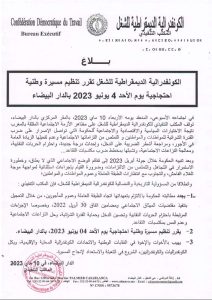 في خطوة تصعیدیة جدیدة، قررت نقابة الكونفدرالیة الدیمقراطیة للشغل تنظیم مسیرة وطنیة احتجاجیة الأحد 4 یونیو 2023 بمدینة الدارالبیضاء.
