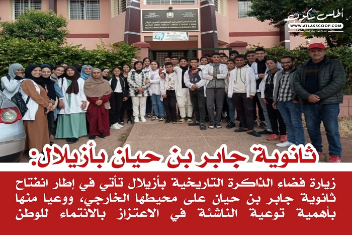 في إطار انفتاح ثانوية جابر بن حيان بمديرية أزيلال على محيطها الخارجي، ووعيا منها بأهمية توعية الناشئة في الاعتزاز بالانتماء للوطن، والافتخار بعبق تاريخه العريق نظم نادي التربية على المواطنة و حقوق الانسان بالثانوية زيارة استطلاعية تثقيفية مفعمة بالوطنية لفضاء الذاكرة التاريخية للمقاومة والتحرير بأزيلال لفائدة تلامذة الثالثة ثانوي إعدادي .