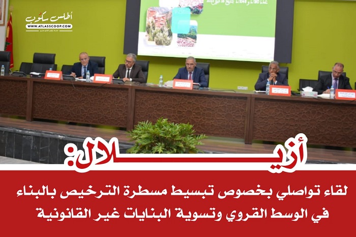 على ضوء إصدار دورية مشتركة بين وزارة إعداد التراب الوطني والتعمير والإسكان وسياسة المدينة ووزارة الداخلية بشأن تبسيط مسطرة الترخيص بالبناء في الوسط القروي، وكذا صدور المرسوم رقم 2.23.103 بشأن منح رخص السوية المتعلقة بالبنايات غير القانونية، وتنفيذا لتعليمات وتوجيهات السيدة وزيرة إعداد التراب الوطني والتعمير والإسكان وسياسة المدينة المتمثلة في تعميم ونشر المستجدات القانونية، عرف صباح يومه الثلاثاء 30 ماي 2023 بمقر عمالة إقليم أزيلال، عقد لقاء تواصلي مع الجماعات الترابية والمصالح الخارجية المعنية بهذا الإقليم، ترأسه السيد عامل صاحب الجلالة على إقليم أزيلال وحضره السيد الكاتب العام بالعمالة والسيد مدير الوكالة الحضرية لبني ملال والسيد المفتش الجهوي للتعمير والهندسة المعمارية وإعداد التراب الوطني والسيد المدير الجهوي للإسكان وسياسة المدينة إضافة إلى السادة رجال السلطة المحلية والسادة رؤساء وتقنيي الجماعات الترابية وكذا ممثلي المصالح الخارجية.
