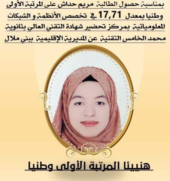 حصلت التلميذة مريم حداش عن الثانوية التقنية محمد الخامس ببني ملال، على المرتبة الأولى وطنيا بأعلى معدل في امتحان نيل شهادة التقني العالي.