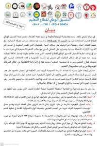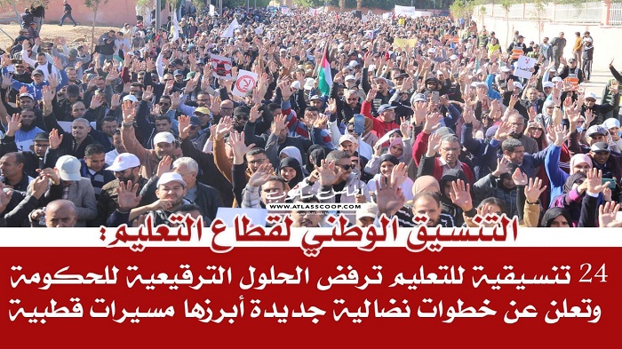 وأكد التنسيق الوطني لقطاع التعليم، استمراره في درب النضال واستعداده لخوض كافة الخطوات النضالية التصعيدية والوحدوية إلى حين تحقيق كافة مطالب الشغيلة التعليمية.