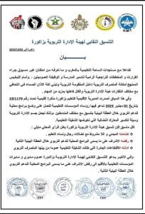 وفي سياق متصل، أكد التنسيق النقابي لهيئة الإدارة التربوية بزاكورة في بيان له، أنه تفاعلا مع مستجدات الساحة التعليمية بالمغرب ومـا تعرفه من احتقان غير مسبوق جراء القرارات و المخططات التراجعية الرامية لتدمير المدرسة و الوظيفة العموميتين، وأمام التبخيس الممنهج لمكانة المتصرف التربوية داخل المنظومة التربوية وتبني لغة الأذان الصماء في التعاطي مع مختلف انتظارات هيئة الإدارة التربوية واثقال كاهلها بمزيد من المهام.