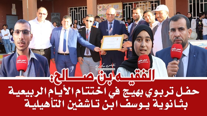 أقامت ثانوية يوسف ابن تاشفين التأهيلية باولاد عبد الله التابعة للمديرية الإقليمية الفقيه بن صالح، أمس الخميس، حفلا تربويا بهيجا في اختتام الأيام الربيعية التي تنظمها المؤسسة بشراكة مع جمعية الآباء تحت شعار “أنشطة الحياة المدرسية دعامة أساسية لمدرسة الجودة”.