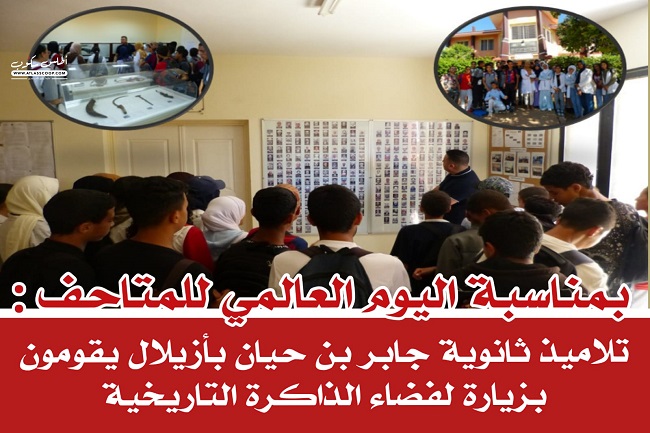 بمناسبة اليوم العالمي للمتاحف الذي يصادف 18ماي من كل سنة وفي إطار انفتاح ثانوية جابر بن حيان بمديرية أزيلال على محيطها الخارجي، وخاصة المحيط الثقافي والفني، ووعيا منها بأهمية توعية الناشئة في الاعتزاز بالانتماء للوطن، والافتخار بعبق تاريخه العريق، ولتمكين الأطفال من زيارة المتاحف والتشبع بروح الإبداع وروح الانفتاح، نظم نادي التربية على المواطنة وحقوق الانسان بالثانوية اليوم الجمعة 17 ماي الجاري زيارة استطلاعية تثقيفية مفعمة بالوطنية لفضاء الذاكرة التاريخية للمقاومة والتحرير بأزيلال لفائدة تلامذة الثالثة ثانوي إعدادي .